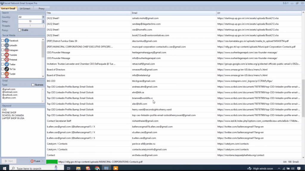 The email extractor tool extracts emails from all social media sites like Facebook, Instagram, TikTok, YouTube, etc. and the email extractor tool can extract directly any website URL extract also software has an advanced feature software will extract with proxy Mood this will help without any issue software will extract 24 hours
